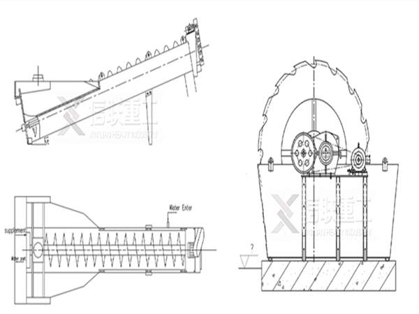輪式洗砂機由齒輪、葉輪、三角帶、減速機、洗料槽等部件組成,輪式洗砂機工作時,由電動機帶動三角帶、齒輪、減速機,齒輪的轉(zhuǎn)動帶動葉輪的轉(zhuǎn)動,在葉輪的帶動下,洗料槽中的砂石發(fā)生翻滾,同時發(fā)生相互研磨的現(xiàn)象,通過翻滾、研磨的運動,砂石表面的雜質(zhì)就會被除去,干凈的砂石會被葉片帶走,然后,干凈的砂石會被旋轉(zhuǎn)的葉輪倒入出料槽,砂石的清洗工作就完成了。